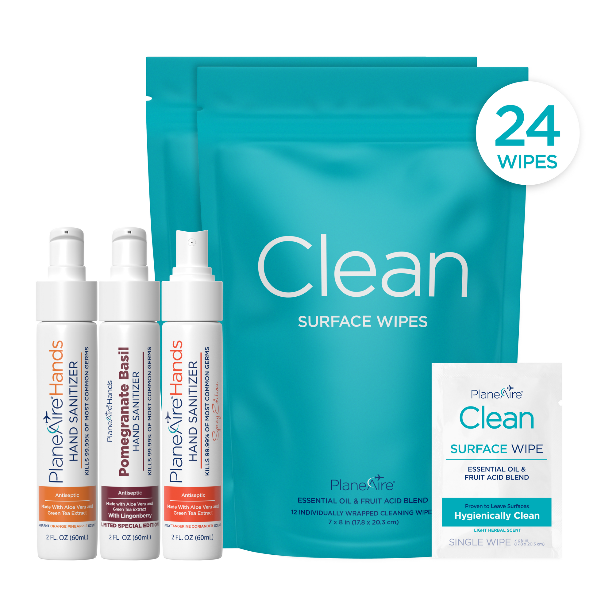 Clean Hands & Surfaces - Anytime, Anywhere – This essential holiday-ready set includes three PlaneAire Hands sanitizers in your preferred scents and two packs of individually wrapped Clean Surface Wipes. Keep one at home, one in your bag, and one at your desk—or gift them to friends, coworkers, teachers, or fellow travelers for an easy way to stay fresh all season long.