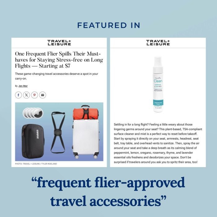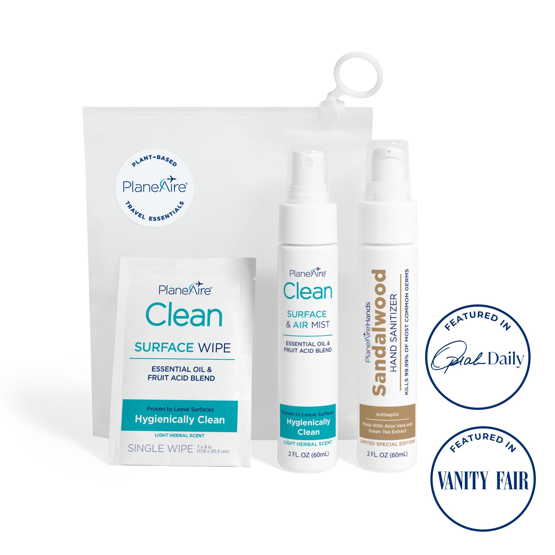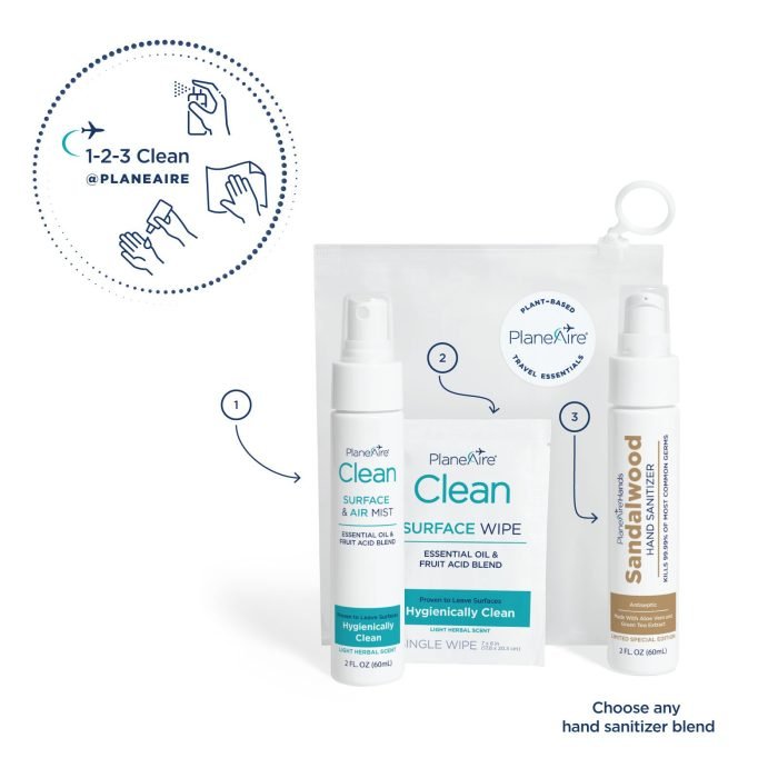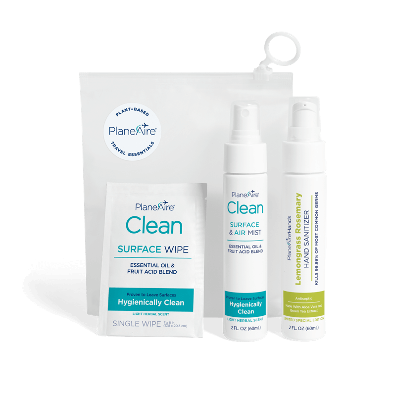 Clean Everywhere You Go – The PlaneAire® Travel Essentials kit includes everything you need for hygienic travel, all packed in a reusable zip-top pouch. Each set contains one Clean Surface & Air Mist, six individually wrapped Clean Surface Wipes, and one PlaneAire® Hands hand sanitizer in your choice of scent—perfect for staying fresh from takeoff to touchdown.