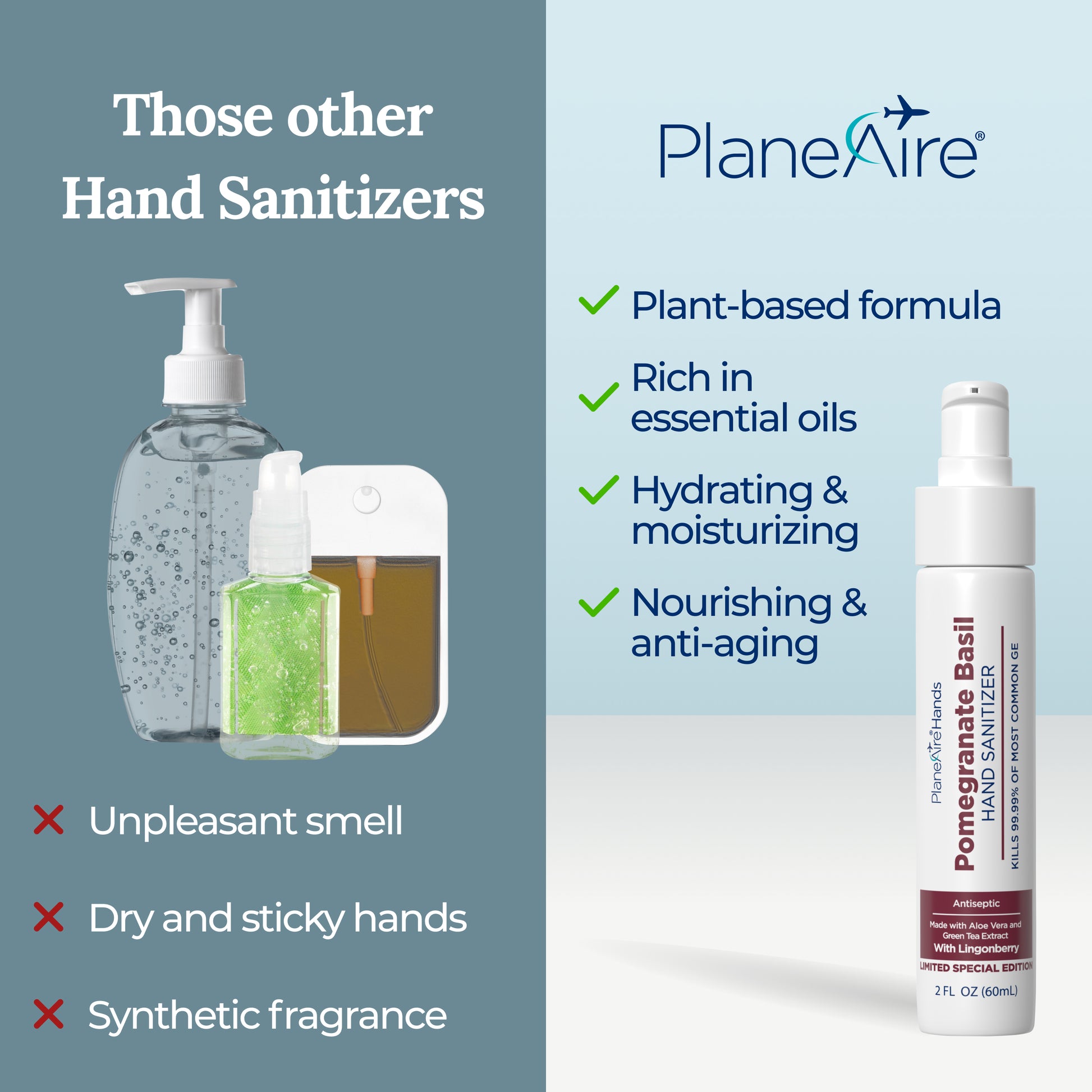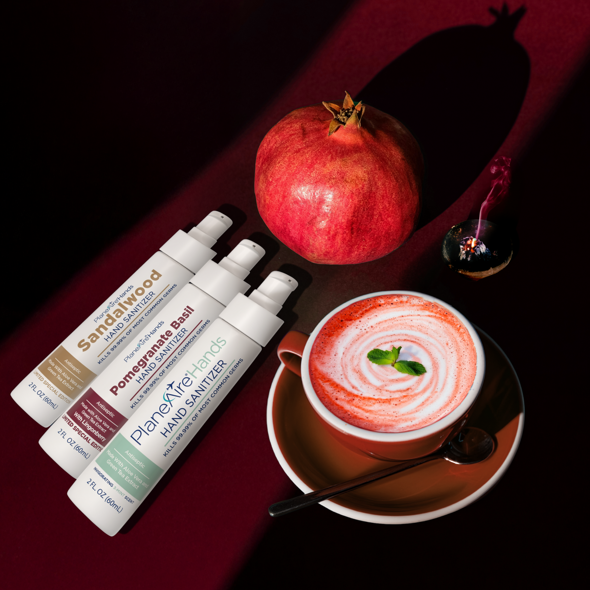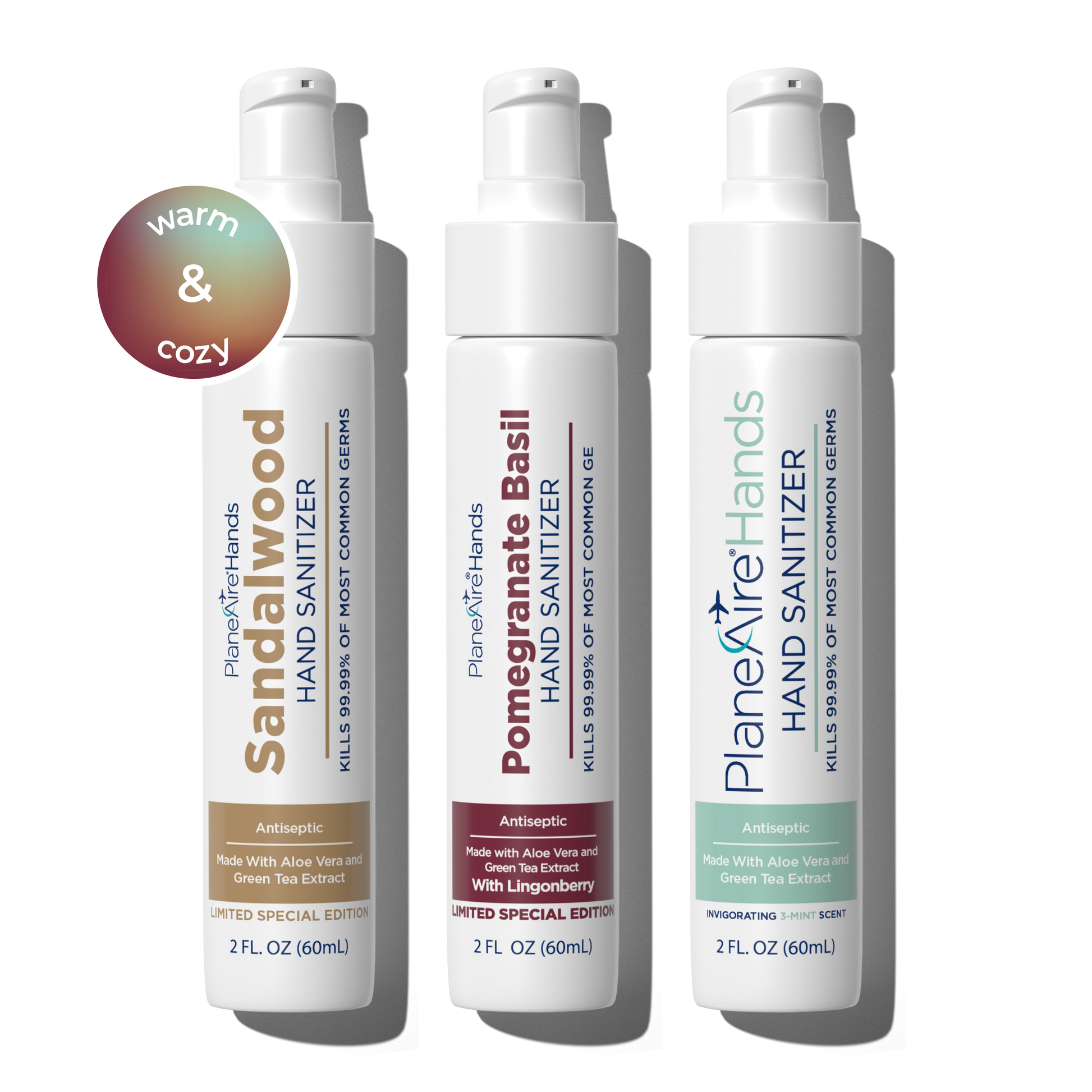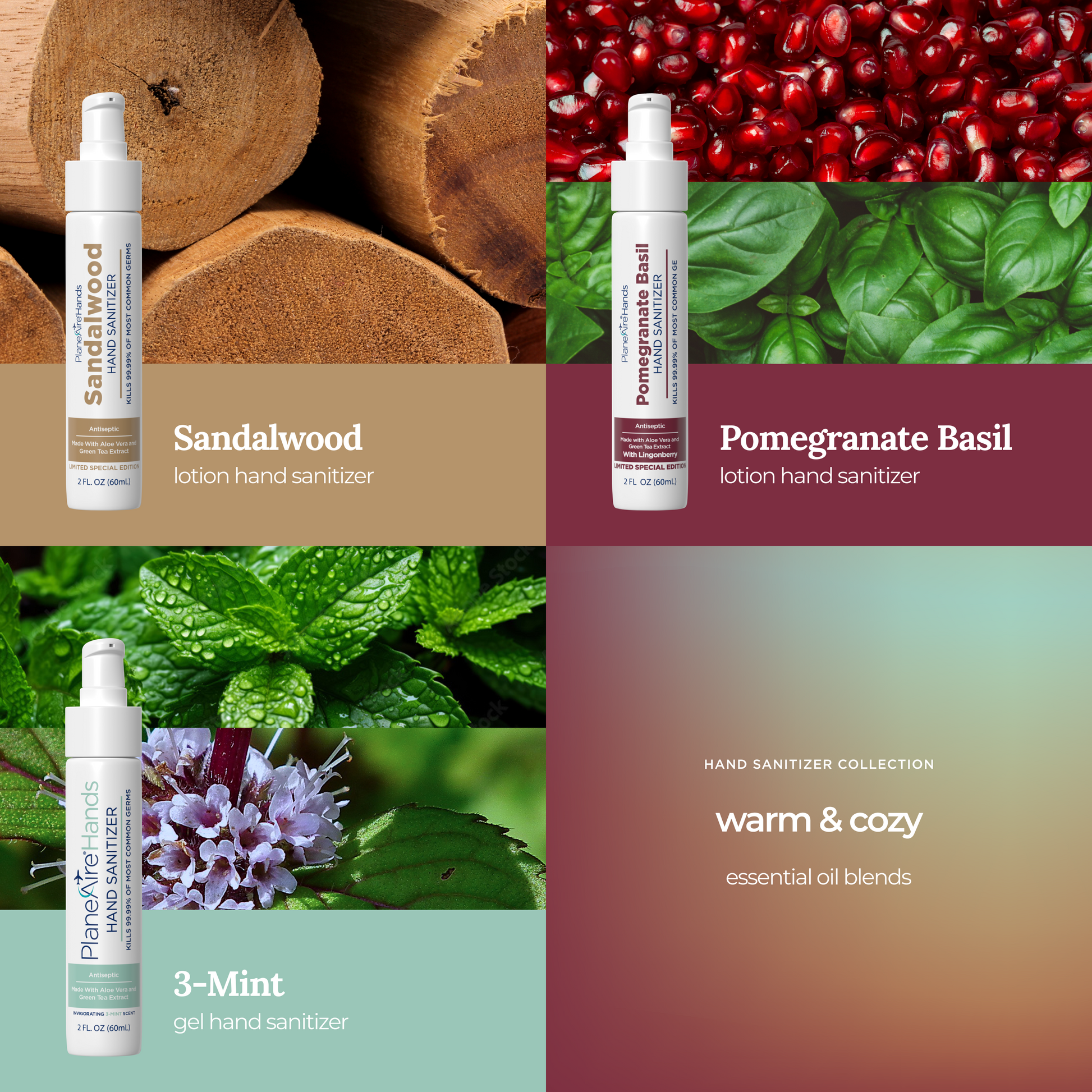Celebrate clean hands with warm, festive scents. The PlaneAire Hands special limited edition Warm & Cozy Variety Pack features three TSA-approved 2 oz. hand sanitizers—Sandalwood Lotion, Pomegranate Basil Lotion, and 3-Mint Gel—each crafted with aromatic essential oils and nourishing plant-based ingredients. Perfect for festive moments or everyday comfort, this seasonal trio leaves hands clean, soft, and subtly scented.