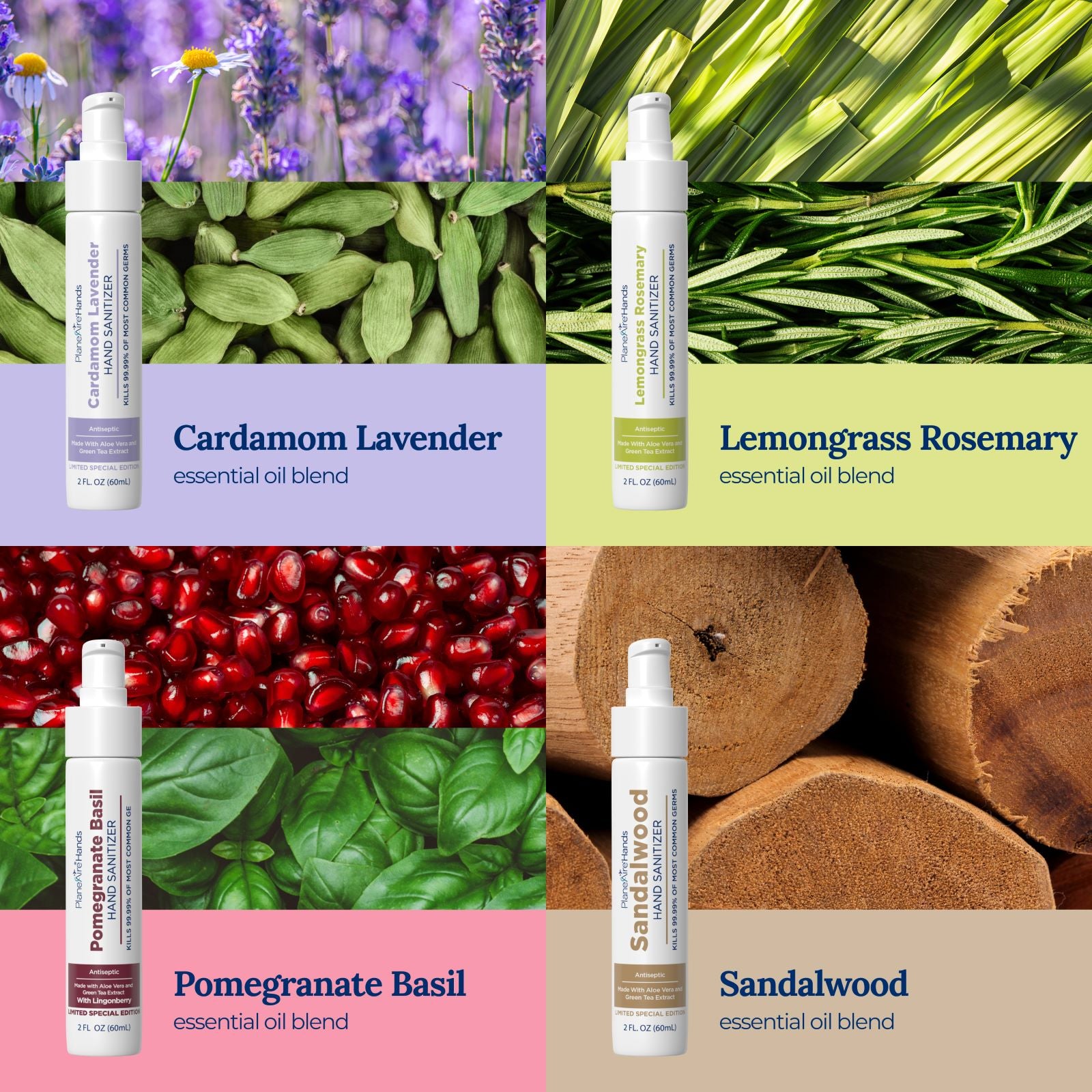 Lotion Variety Pack Edition – Say goodbye to dry, irritated hands with this luxurious collection of moisturizing hand sanitizers. Each ultra-silky formula is infused with soothing scents: Sandalwood, Pomegranate Basil, Lemongrass Rosemary, and Cardamom Lavender.