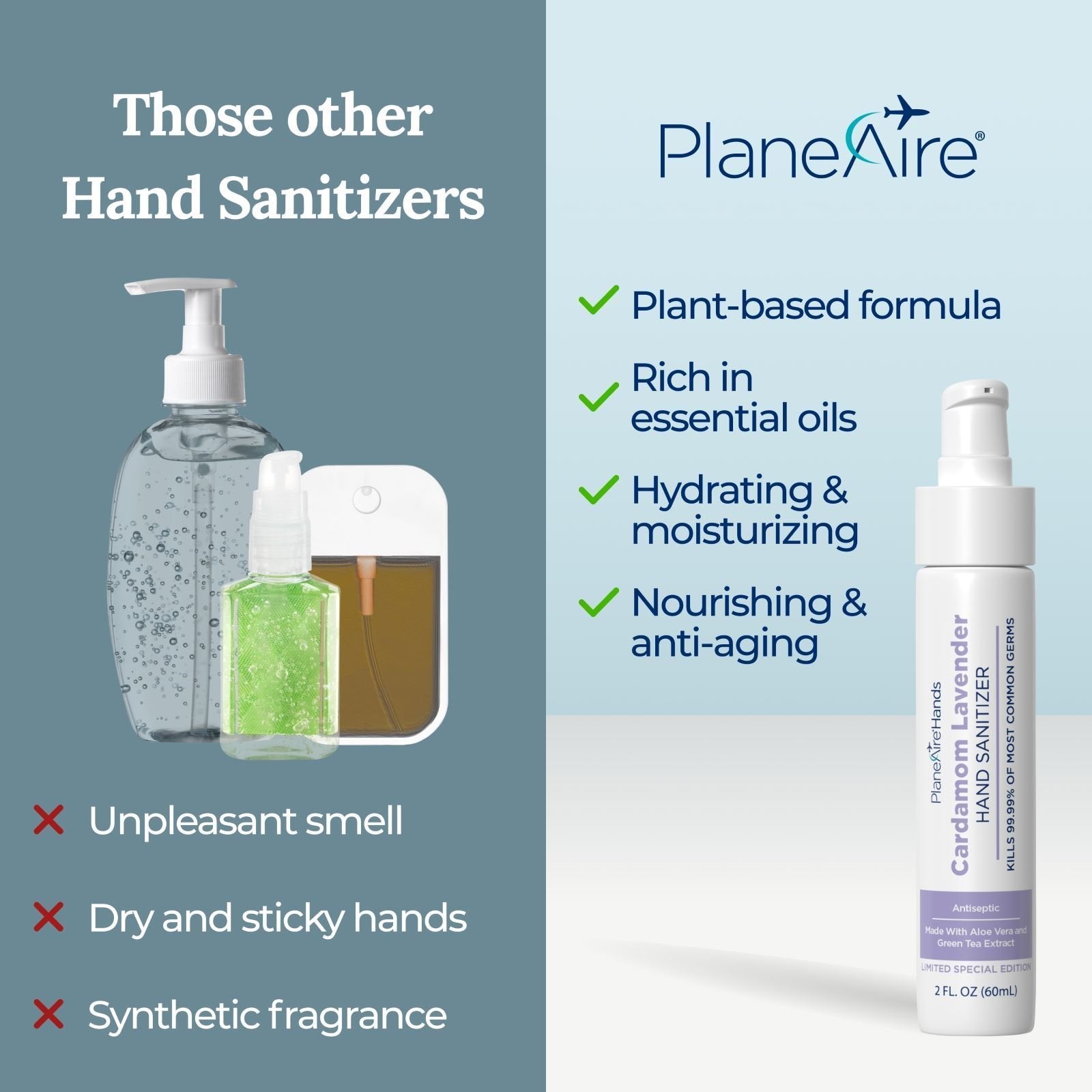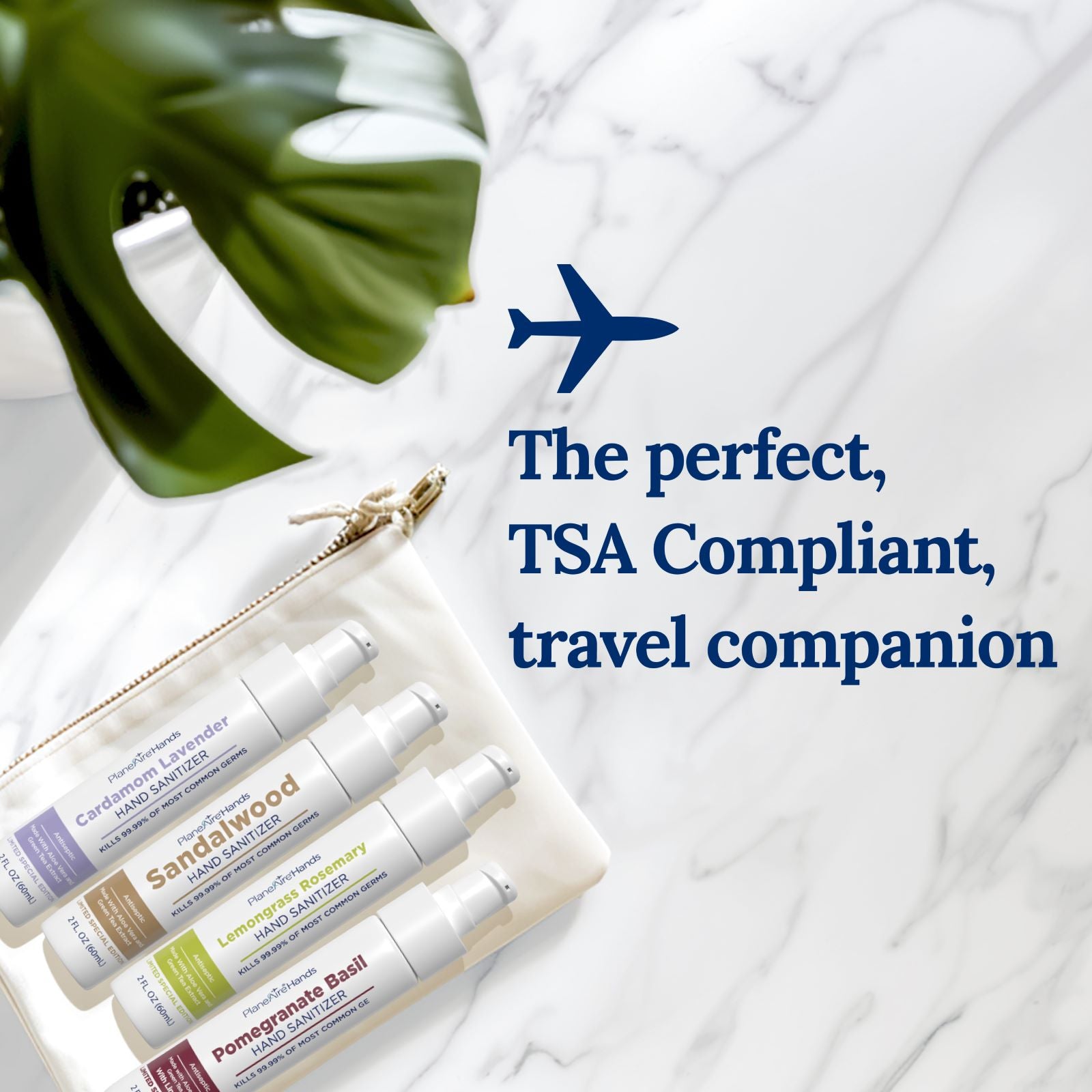 Experience clean, hydrated hands in four signature scents. The PlaneAire® Hands Lotion Variety Pack features TSA-approved 2-in-1 lotion hand sanitizers that sanitize and moisturize in one silky step. Made with 70% plant-based alcohol, pure essential oils, and a nourishing blend of plant-based ingredients, each formula leaves hands soft, clean, and refreshed. With scents like Sandalwood, Pomegranate Basil, Lemongrass Rosemary, and Cardamom Lavender—plus a free travel pouch—it’s the perfect way to elevate your hand care routine at home or on the go.